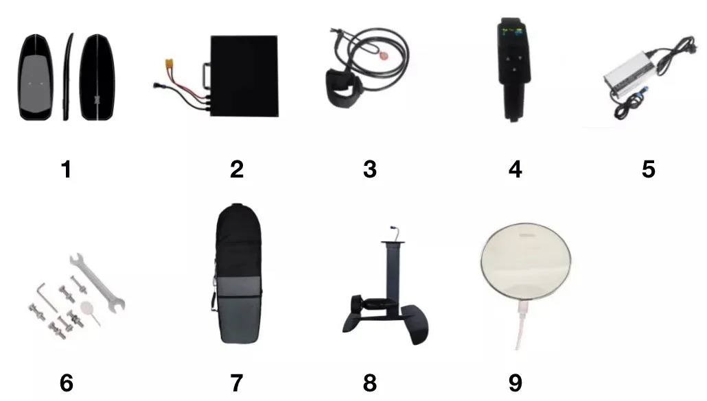 1*Lithium battery 1*Fairwater sleeve + Propeller; 1*Remote control; 1*Front Wing + fuselage + Rear Wing; 1*Motor + mast; 1*Inverter; 1*Charger; 1*Leash + magnetic switch; 1*Board bag |
